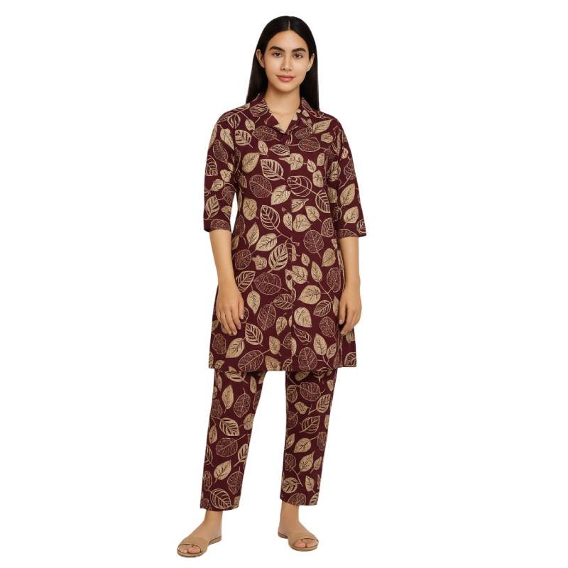Elevate your wardrobe with this women’s wine leaf print co-ord set, featuring a collared kurta-style top with button closure and matching pants. Crafted from soft, breathable fabric, this set offers the ideal blend of comfort and style. Its eye-catching leaf print adds a trendy flair, making it suitable for casual outings, office wear, or relaxed lounge days. Pair it with sandals, flats, or sneakers to create a versatile and chic look.